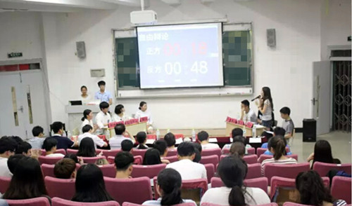 商务系学生会学习部结合辩论赛的独特魅力, 以促进思想交流, 展现精英风采为出发点,为增进系各班同学间的友谊,于5月28日晚在2318阶梯教室举办了商务系辩论赛的表演赛。本次比赛邀请了院团委书记陶元老师、商务系主任李庆海以及商务系党总支副书记过芹芹、团总支书记易烈翔等嘉宾,更有幸请到了各兄弟系的团总支书记、辅导员莅临现场做评委,同时我系班主任夏相忆、袁富红、王竹君等老师和学生会主席团成员以及各系团副也来到现场观摩这场辩论赛。