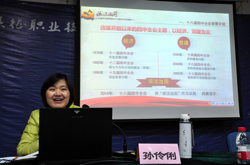 专题辅导会上,孙伶俐老师围绕四中全会的背景、主要内容、公报的亮点和如何落实依法治国四个方面进行精彩授课,并结合目前暴露出的社会问题,深入浅出的分析了法治中国建设面临的境况和挑战。她指出,法治梦是“中国梦”的应有之义和基本保障,党的十八届四中全会第一次在建党历史上把法治作为中央全会的主题,对全面推进依法治国进行了顶层设计,提出了指导思想、总体布局、根本要求、实现途径和战略任务,为建设社会主义法治国家指明了方向,对新时期工作提出了新的更高要求。我们要深刻认识到学习贯彻十八届四中全会精神的重要意义,切实把思想和行动统一到四中全会精神上来,将法治精神内化于心、外化于行,做到在思想认识、制度建设、改革发展中以“法”字当头,规矩行事,用法治来武装头脑、指导实际、推动工作。