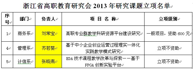 经过广泛发动,各位老师积极申报,我院在浙江省高职研究会2013年研究课题立项中,刘常宝副教授、苏若葵老师、张晓燕老师分别申报的《高职专业群教学科研资源平台建设研究》等三个课题获得立项。