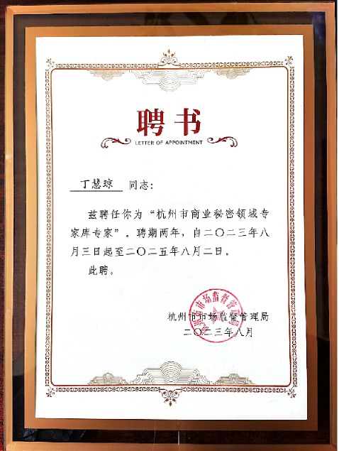 根据杭州市市场监督管理局杭市管函〔2023〕188 号文件,我校丁慧琼教授入选第一期杭州市商业秘密领域专家人才。