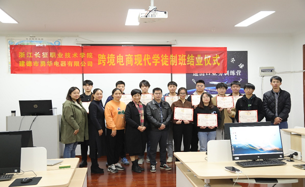 11月10日,我校商贸学院在实训楼南111室顺利举行了长征·勇华首届跨境电商现代学徒制班结业仪式。商贸学院院长王珍、建德市勇华电器有限公司总经理朱国强、运营主管李洪建、商贸学院教师和学徒班成员代表参加了仪式,仪式由国贸教研室主任陈露主持。