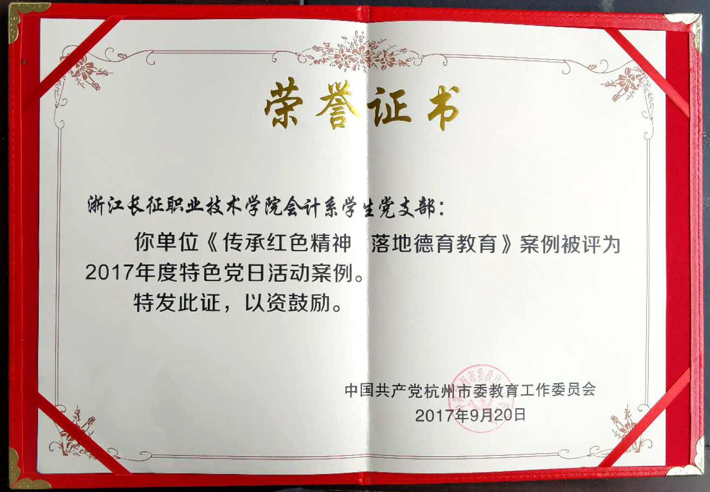 2017年9月,经基层推荐,杭州市教育工委考核评比,我院会计系学生党支部“传承红色精神 落地德育教育”案例被评为2017年度特色党日活动案例。