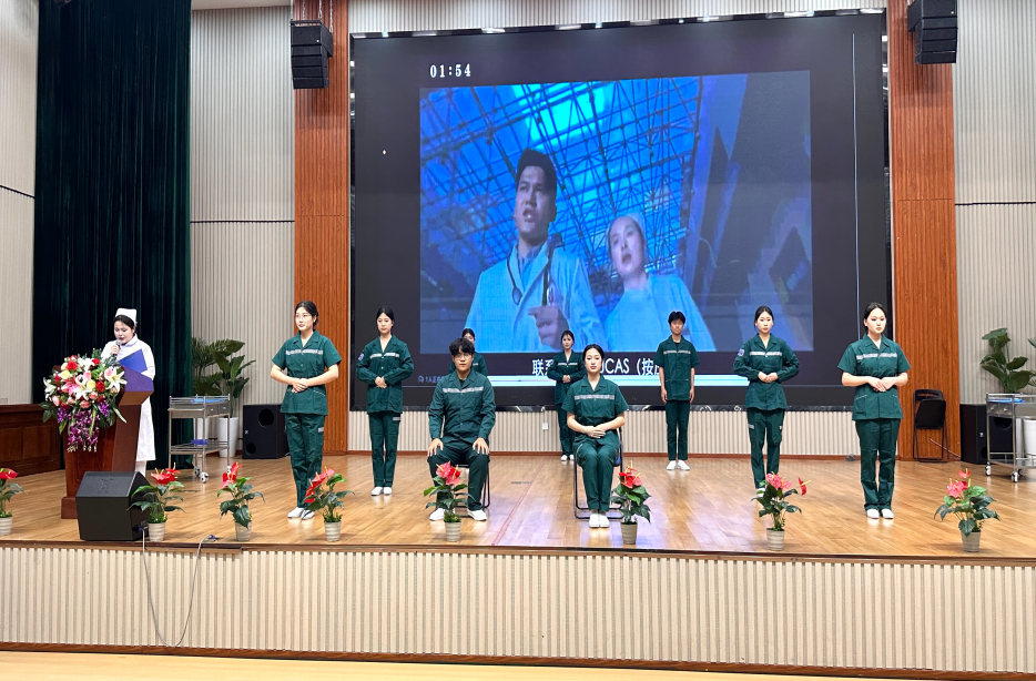决赛现场,参赛团队通过情景模拟,生动还原护理工作中的真实场景。选手们身着护士服,身姿挺拔,以标准站姿、优雅手势和亲切微笑,充分展现出护理人员端庄大方、专业严谨的职业风采。在治疗操作演示环节,选手们动作娴熟精准、流程规范有序,将“以患者为中心”的服务理念贯穿始终。学院礼仪队带来的手语舞蹈《守护之光》更是将现场气氛推向高潮,队员们用灵动的手势、真挚的情感,传递出护理职业的温暖与责任。